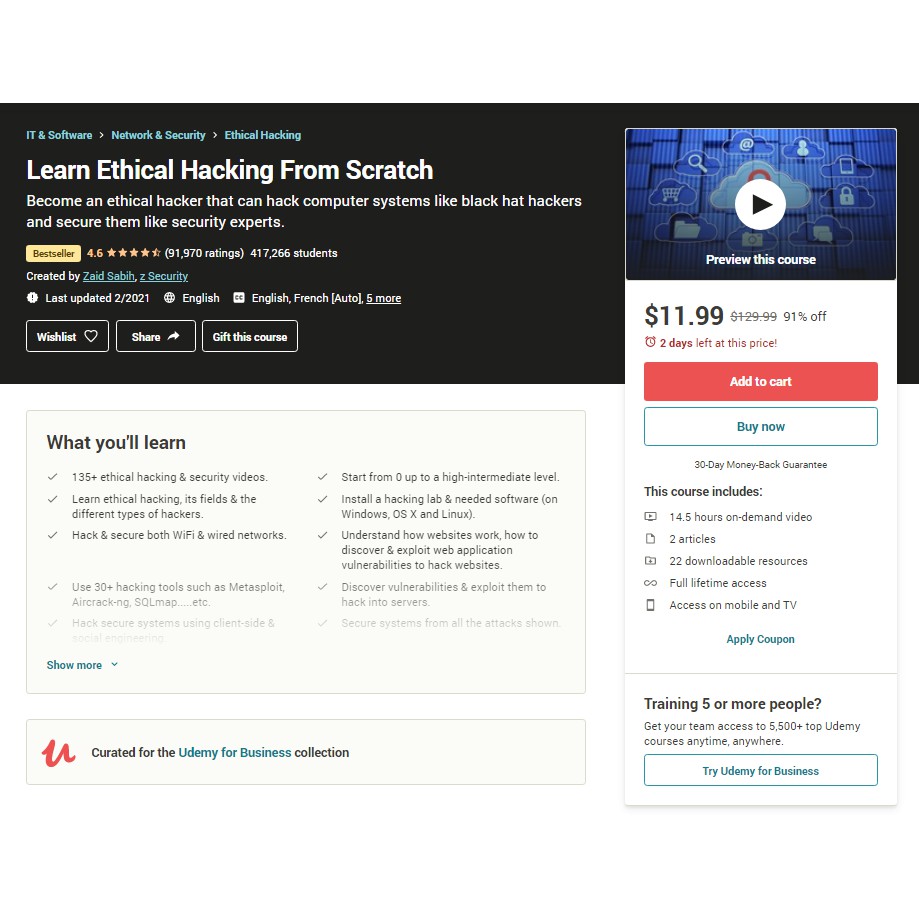 Ethical Hacking and Network Security from Scratch in 2022 Best Seller Course : Complete Ethical Hacking Bootcamp 2022: Zero to Mastery. Learn How to set up a Hacking Lab (Kali Linux, Metasploitable, VMs). You will MASTER Ethical Hacking and Network Security Key Concepts (Reconnaissance, Sniffing, Exploitation …). Acquire the Skills to MITIGATE ALL THE ATTACKS presented in the course.